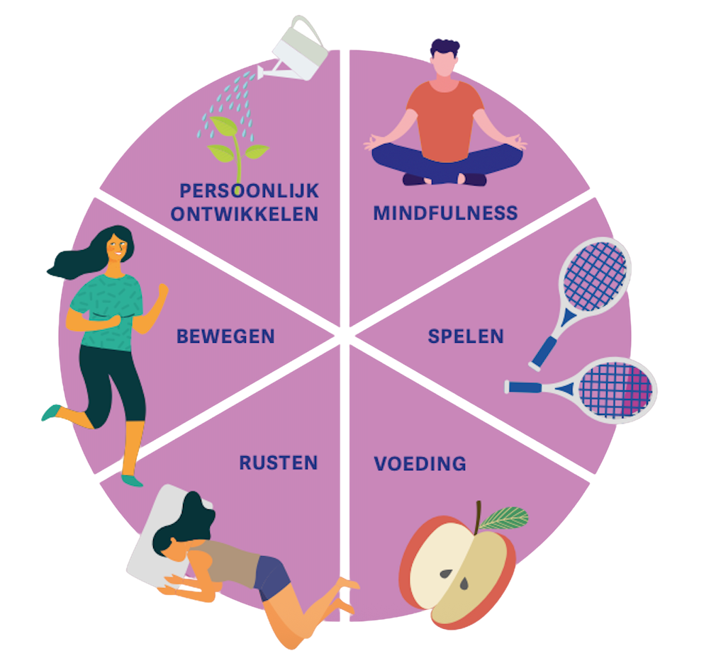 - Aanpak van je lifestyle — ondermeer op basis van de Zes tegen Stress: rusten, beweging, voeding, mindfulness, persoonlijk ontwikkelen en spelen.