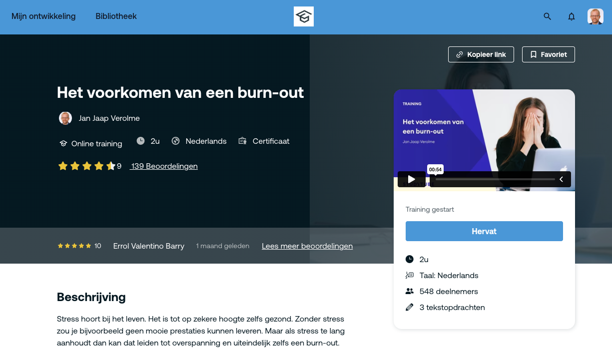 Verder geeft hij workshops en trainingen over stress en burn-out. Ook online. De training 'Het voorkomen van een burn-out', die hij ontwikkelde voor het leerplatform StudyTube, is inmiddels meer dan 550 keer afgenomen en kreeg een negen als gemiddelde waardering.