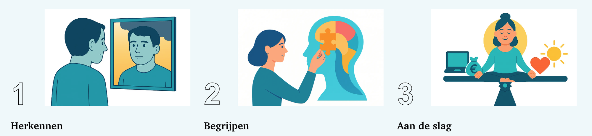 De aanpak bestaat uit drie stappen: herkennen, begrijpen en aan de slag gaan.Die route bestaat uit drie stappen: herkennen, begrijpen en aan de slag gaan.